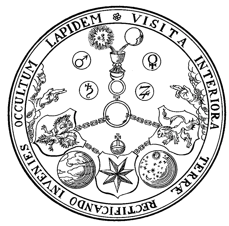 Если прям идти по текстам Розенкрейцеров, то в Гробнице был обнаружен "престол, покрытый листом желтой меди, на котором стояла надпись: A.C.R.C. Этот компендиум (краткое изложение) вселенной сделал я при жизни себе гробницей, и вокруг первого обода или края стояло: Иисус для меня – все. В середине были четыре фигуры, заключенные в круге, над которыми стояли следующие четыре надписи: