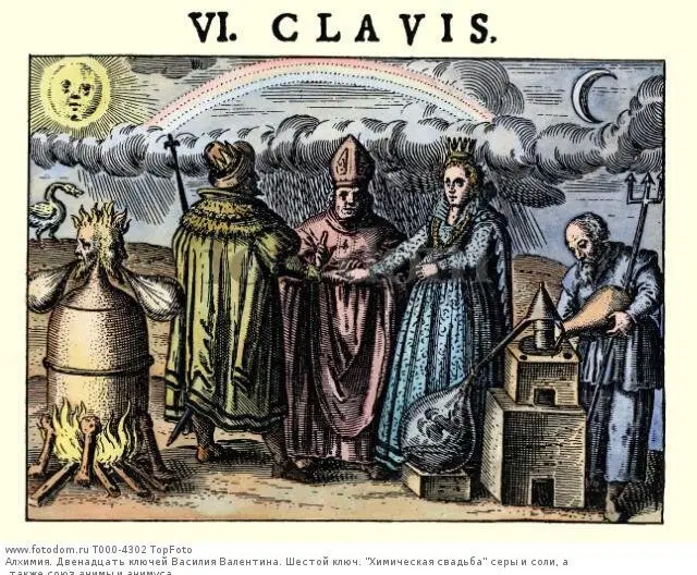 Роль свадьбы также существенна. Священный брак — иерогамия — занимает важное место в античных мистериях. У многих авторов тема духовной свадьбы связана с темой обновления и рождения заново. Именно воскрешение короля и королевы, являющееся центральной темой, и понимается как бракосочетание, тогда как сама брачная церемония вовсе не описывается в романе. В рамках интерпретации образов романа как объектов, принадлежащих к внутреннему миру духоиспытателя, обезглавливание королевских особ — одно из событий его собственного душевного развития, а именно осознания того, что материальные силы познания преобразуются из сил физического роста, лишь принимая в себя смерть. Это опыт открытия природной алхимии, живущего во всём неживого начала, которое только и видимо при обычном рассмотрении. Чтобы из материальных процессов начали высвечиваться духовные, необходим переход к алхимии, культивируемой искусственным образом, когда человек внутри душевной сферы придаёт своим познавательным силам такой характер, какого они в процессе простого органического развития не приобретут.