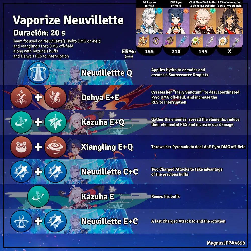Dehya leaves, with her Elemental Skill, a "Fiery Sanctum" on the field that deals coordinated AoE Pyro DMG. Thanks to its functionality, it is perfect for maintaining the Neuvillette's RES to interruption in a wide AoE.