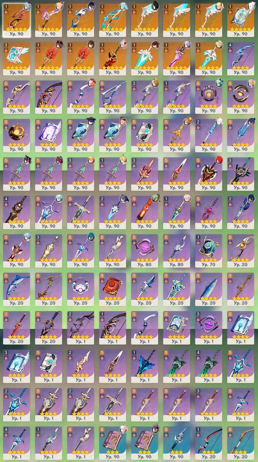 До 90 уровня прокачаны 34 персонажа, до 80 уровня 7 персонажей, а остальные 12 до 70 уровня чисто ради круток. Это наверное одно из самых больших изменений за год. Раньше у меня было много 80 персонажей, а тех, кем я не играл, я вообще оставлял 50 уровня. Сейчас же у меня даже саппорты прокачаны до 90 с 9 талантами, а те, кем я не играю, до 70 ради синих круток.