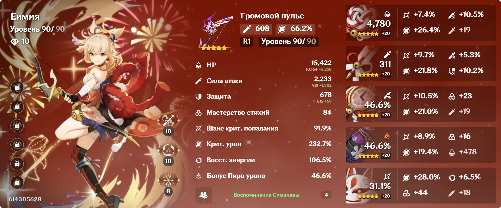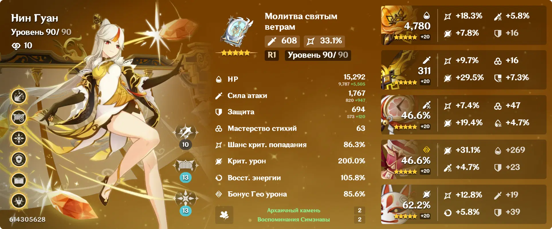 В конце похвастаюсь двумя своими самыми сильными в плане прокачки персонажами. Еимией на 251.9 критмассы и Нин Гуан на 246.4 критмассы.