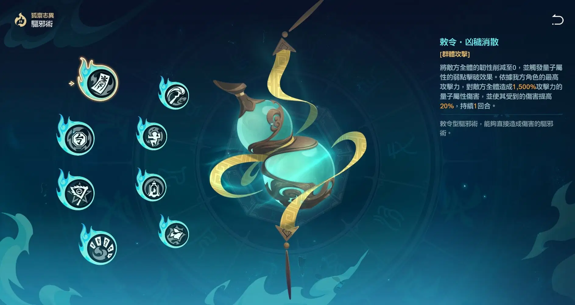 在完成調查委託後,我們有機會獲得【驅邪術】。在活動中一共有8個【驅邪術】,在關鍵的戰鬥時使用,可以助我們一臂之力。