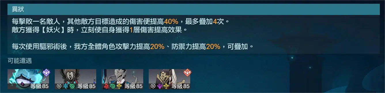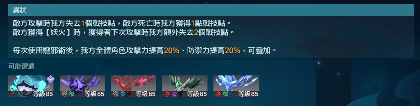 3.戰鬥機制:在行動條上會出現【妖火】,在我方的行動回合獲得【妖火】,會給我方驅邪術充能;如果敵方的行動回合獲得【妖火】,敵人的傷害將大大增強。