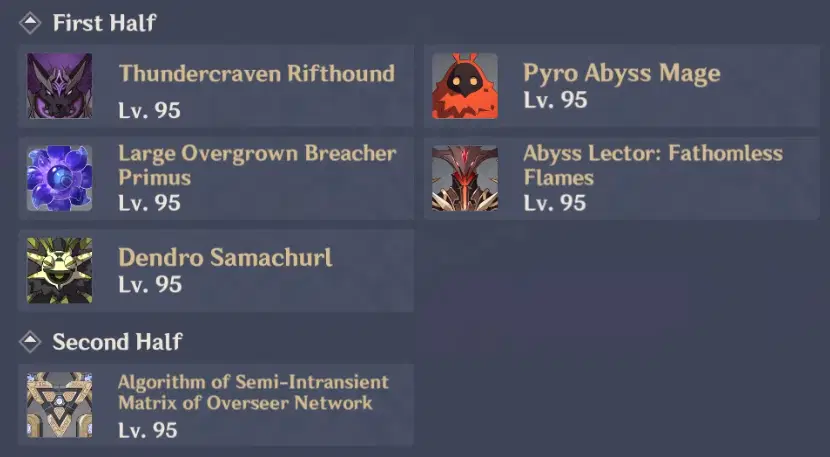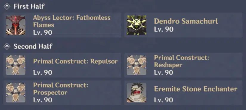 Recommended Strategy: The first half is relatively easy. Prioritize downing the Dendro Samachurl in the first wave to avoid having Dendro applied to your character; Prioritize Pyro Abyss Mage in the second wave to avoid having Overloaded triggered on you; The third wave has fairly high DMG, so pay attention to your dashes. As long as you have characters that can reliably apply Hydro, you won’t have too much trouble clearing this one.