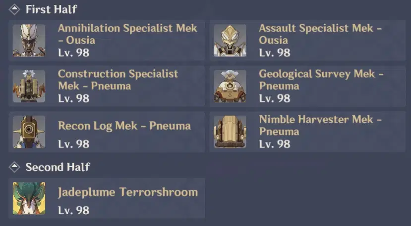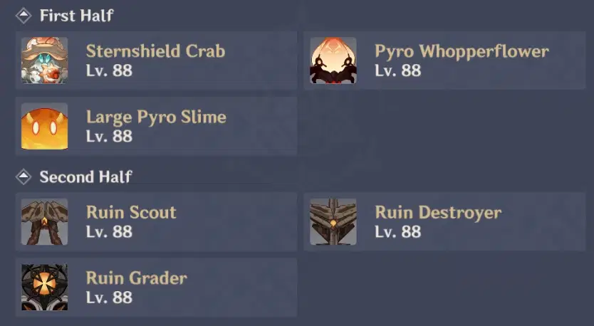 Most enemies in the first half are Pyro-aligned, so Dendro characters are discouraged in your setup. If you have characters that can vacuum and group enemies, bring them, and Hydro/Cryo characters that have AoE attacks are recommended.