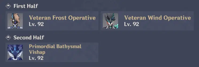 The Frost and Wind Operatives in the first half have high Anemo/Cryo RES. Pull and group them then defeat them normally.