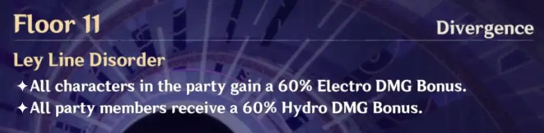 The Leyline Disorder on Floor 11 grants 60% Electro and Hydro DMG Bonus to all members in the party.