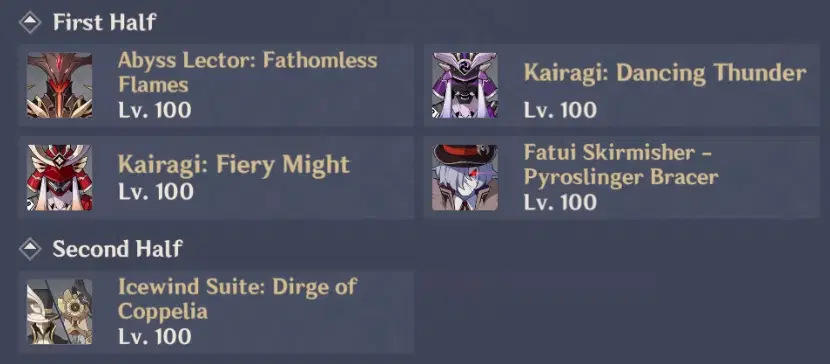 Wave 1: Kairagi: Fiery Might*1 + Kairagi: Dancing Thunder*1 + Fatui Skirmisher - Pyroslinger Bracer*2.