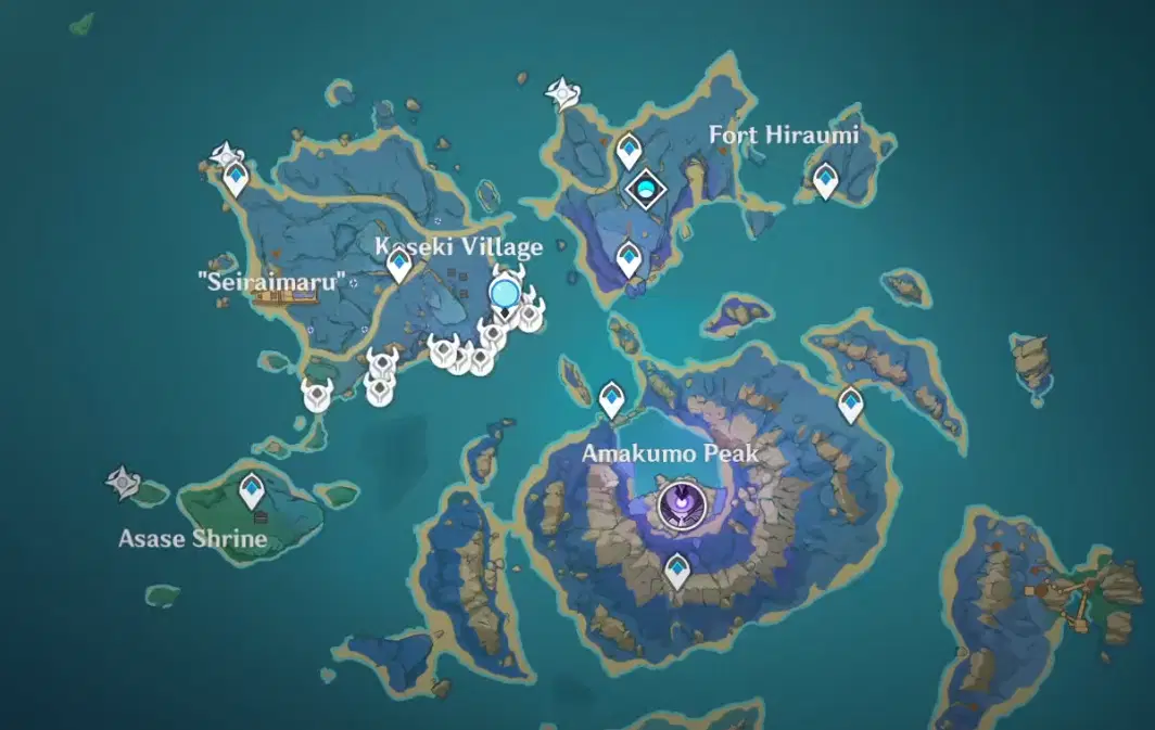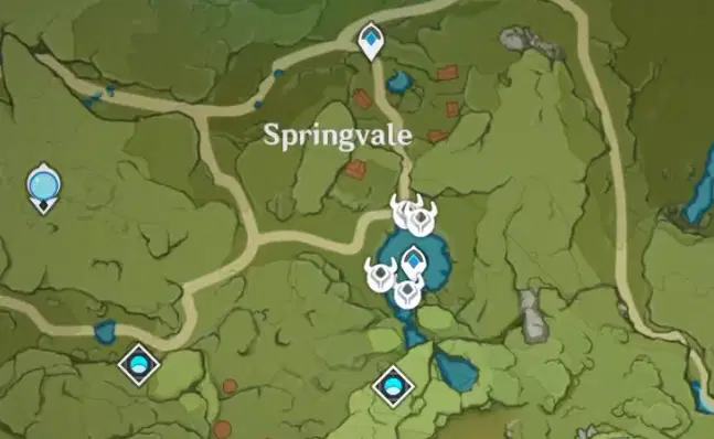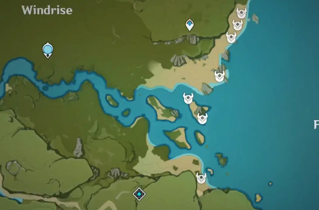 The below picture shows the 1 area I recommend for today. I also included additional areas below that just in case too many creatures were scared away or they were killed by accident. If the creature was scared away and not killed, they will respawn again in a few minutes or less if you teleport to another area. The hilichurl symbols mark the approximate areas you can find the blue creatures. Sometimes the creatures don't spawn correctly, so you may not find them. This happened to me a few times in the past when farming and even in the present when doing the gif. Because of this, I recommend moving on to the next creature right away to save time.