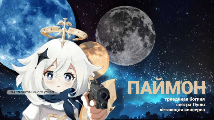 На этом пожалуй остановимся. Так много информация, что котелок уже не варит) В любом случае, мир Тейвата крутится вокруг Паймон и эта лошадка определённо выстрелит в финале игры. Кто знает, может и предательство со стороны триединой богини будет носить ключевой момент, а там глядишь она как трансформер соберётся в Изначального. Ха-ха, шучу. Наверно. А может она хочет с помощью Царицы устранить всех архонтов, богов порядка и быть единственной Небесной Владычицей?