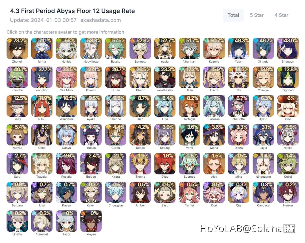 Рейтинг персонажей по частоте использования на 12 этаже в Бездне 4.3 (от 3.01.2024 г.)