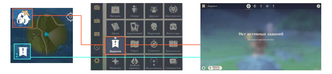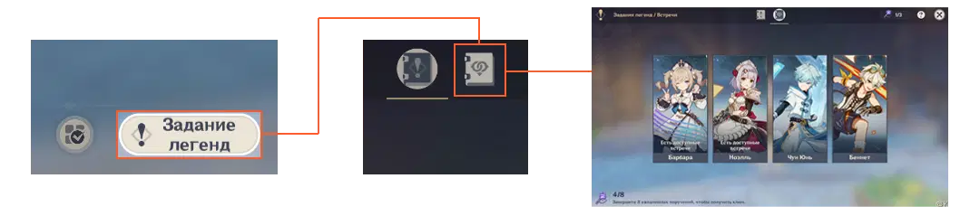 Задания легенд можно открыть через меню Паймон или нажав на значок заданий, оба значка расположены в левом верхнем углу экрана, рядом с мини-картой.