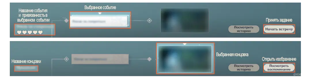 Нажав на интересующее вас событие, вы выберете его. Слева внизу будет показано название события и индикатор привязанности текущего этапа. Справа внизу, нажав на "Посмотреть историю", вам кратно будет описано происходящее в выбранном событии. Нажав на кнопку "Начать встречу", вы сможете получить задание на выбранном этапе встречи, чтобы продолжить ее. Если вы выберете концовку события, то вместо кнопки "Начать встречу" будет кнопка "Посмотреть воспоминание", при нажатии на которую вы сможете посмотреть "Воспоминание" (изображение окончания встречи).