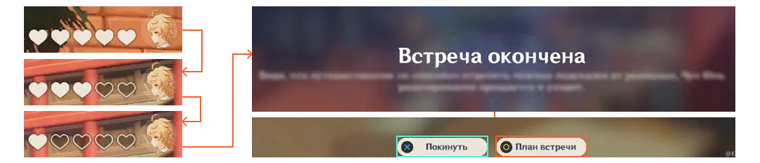 Индикатор привязанности показывает отношение персонажа к главному герою (путешественнику или путешественнице). Выбирая варианты ответов, которые расстраивают персонажей, вы теряете сердечки. Когда вы потеряете все сердечки встреча закончится, вы можете "Покинуть" ее или перейти в "План встреч", чтобы попытаться снова.