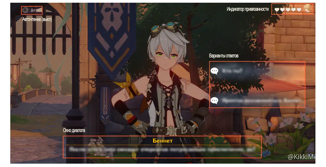 Перейдя в режим встречи вас будет приветствовать новый интерфейс. Справа вверху находится индикатор привязанности (5 сердечек и иконка главного героя), слева вверху находится режим авточтения (значок кружка со стрелкой и сокращение "Авто") внизу по середине окно диалога (имя персонажа выделено желтым, а сам текст белым), по центру стоит персонаж, с которым можно общаться, а около него будут появляться варианты ответов.