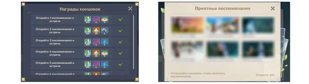 В "Плане встречи" можно посмотреть сколько концовок вы открыли, посмотреть и/или забрать награды (награды могут незначительно отличаться, в зависимости от выбранного персонажа с которым проводятся встречи), посмотреть воспоминания (альбом с изображениями концовок). Когда вы получаете "Воспоминание", то можете в любой момент посмотреть его в "Плане встреч", а также открыв его, нажмите кнопку "Сохранить", чтобы сохранить изображение концовки себе. *Если вы выбрали путешественника как главного героя, то на изображениях будет он, а если путешественницу, то на них будет она.