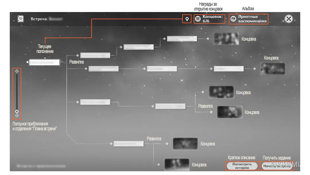 Здесь вы можете увидеть открытые и закрытые разветвления (переломные моменты, которые влияют на события) сюжета. В "Плане встречи" можно увидеть ваше текущее положение в схеме из событий и развилок. Двигать схему можно зажатием ПКМ, уменьшить или приблизить план встречи можно используя ползунок слева или же колесико мышки.