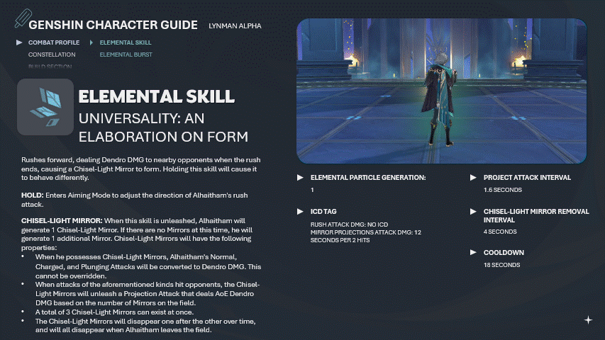 ➤ Alhaitham's core kit can be found on his Elemental Skill. Your goal is to sustain the Chisel-Light MIrrors in order for Alhaitham to gain converted Dendro DMG attacks and unleash Projection Attacks, which help him deal with high damage values. Additionally, his Elemental Skill scales on Alhaitham's Elemental Mastery.