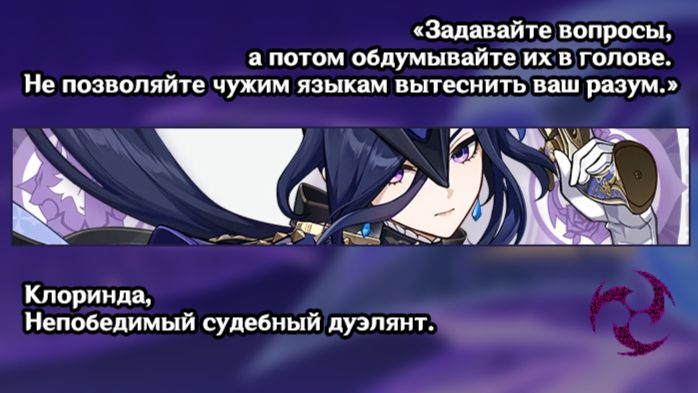 Клоринда судьбоносный дуэлянт Фонтейна — героиня с удивительной судьбой. Она прошла через множество испытаний и опасностей, научилась постоять за себя с ранних лет. Потеряв родителей и единственную наставницу, она не опустила руки. Напротив, она продолжила свой путь, защищая интересы Фонтейна и предоставляет возможность самим выбирать свою судьбу. Именно поэтому она так уверенно сражается в дуэли не только за свою часть, но и за честь правосудия.