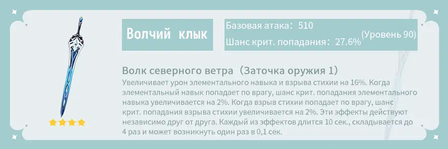 Анализ: Новое оружие Боевого пропуска Волчий клык имеет базовую стату, обеспечивающую 27,6% крит. шанса. При пробуждении до 5 уровня он дает 32% бонуса к урону от элементального навыка, что делает его подходящим для Фурины, которая в основном полагается на элементальный навык. Среди 4-звездочного оружия ожидаемый урон Волчьего клыка 5-го уровня является самым высоким и достигает 89,4% от сигнатурного оружия.