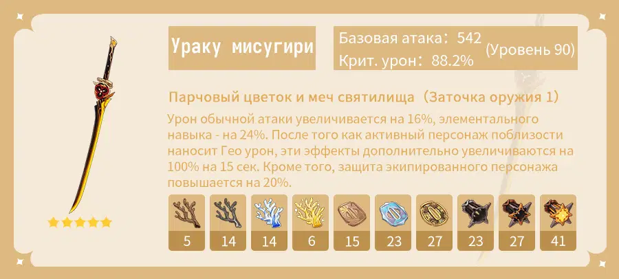 Анализ: Статистика Ураку мисугири обеспечивает 88,2% крит. урон. Эффект оружия увеличивает урон от обычной атаки и элементального навыка, а если рядом находится член отряда, наносящий Гео урон, эти эффекты усиливаются. Так же увеличивается защита владельца. Урон от элементального навыка, наносимый этим оружием, уступает только сигнатурному, а в паре с Гео-ударами товарищей по команде он может даже превзойти сигнатурное оружие.