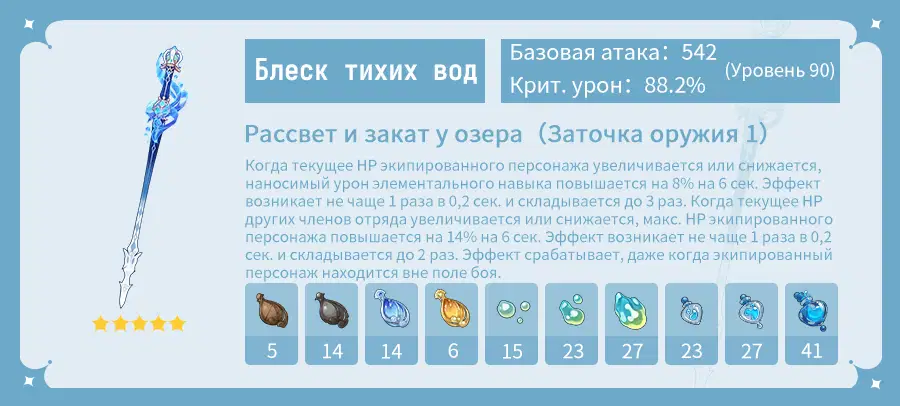 Анализ: Сигнатурное оружие Фурины Блеск тихих вод дает бонус к крит. урону на 88,2%. Эффект оружия заключается в том, что при увеличении или уменьшении текущего HP экипирующего персонажа увеличивается наносимый урон элементального навыка; при увеличении или уменьшении текущего HP других членов отряда увеличивается максимальный HP экипирующего персонажа, что идеально сочетается с механизмом навыков Фурины и позволяет максимизировать отдачу.