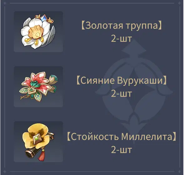 Альтернативный набор: 2-шт [Золотая труппа]+2-шт [Сияние Вурукаши]/2-шт [Стойкость Миллелита]