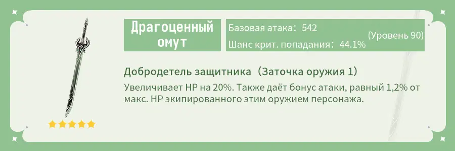 Анализ: Субстат Драгоценный омут обеспечивает 44,1% крит. шанса. Эффект оружия увеличивает HP на 20%, что идеально подходит Фурине. Он служит хорошей альтернативой ее сигнатурному оружию.
