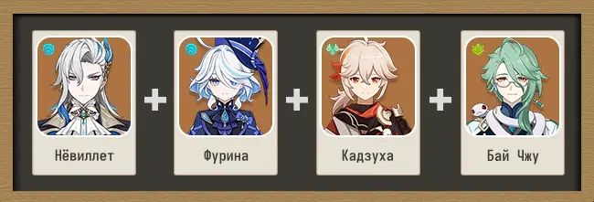 Стратегия: Фурина EQ + Кадзуха EQ для группировки врагов+Бай Чжу EQ+Невиллет EQ для заряженной атаки на поле.
