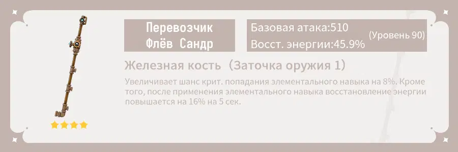Анализ: Статистика Перевозчик Флев Сандр обеспечивает восстановление энергии, облегчая потребность Фурины в энергии при C0. Эффект оружия увеличивает скорость крит. шанса от элементального навыка и повышает восстановление энергии на 5 с. после его использования. Как субстат, так и эффект оружия очень подходят Фурине, что делает его жизнеспособным вариантом в отсутствие вышеупомянутого 5-звездочного оружия.
