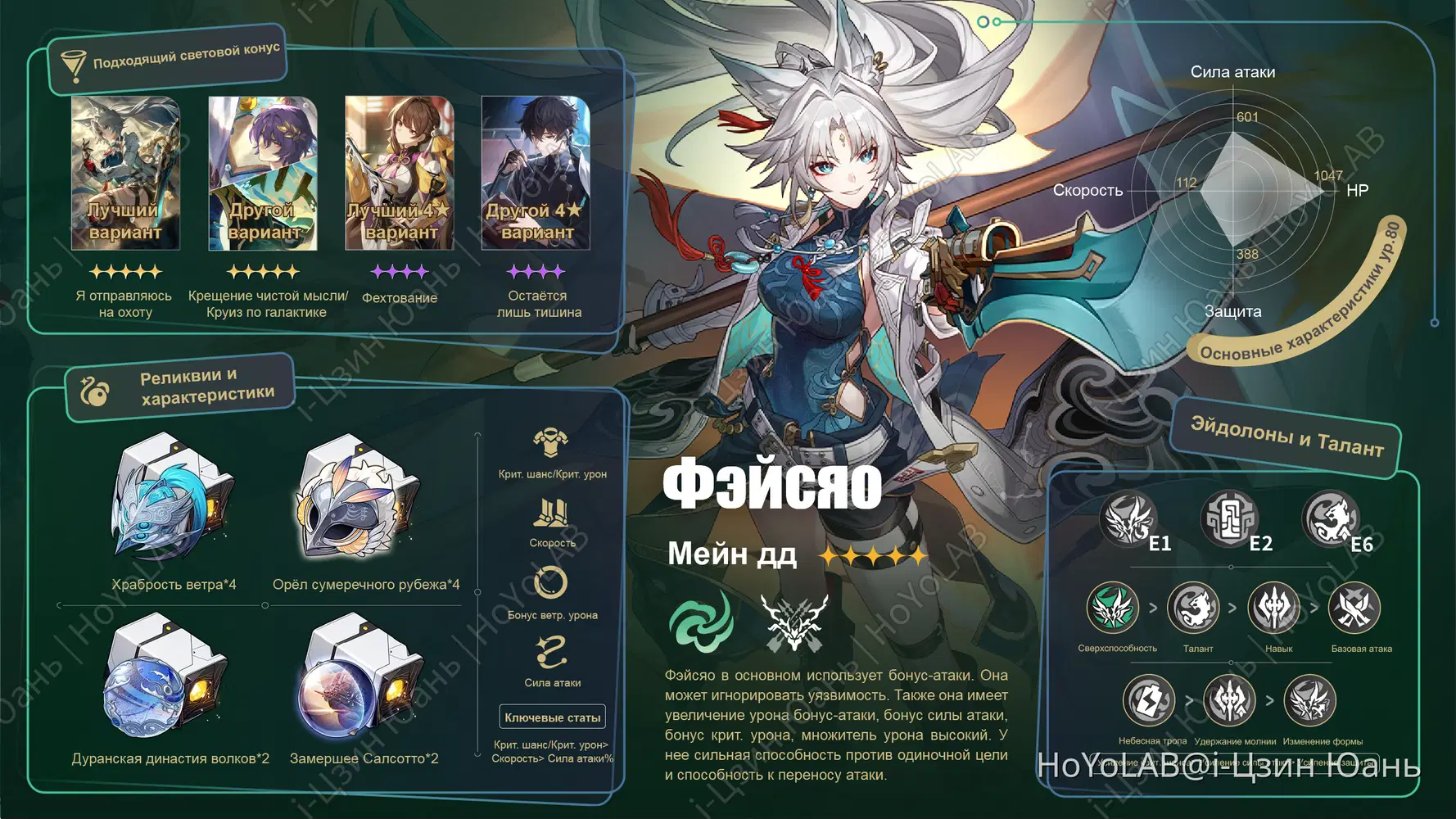 Бонус крит. урона/силы атаки. Доп. способность позволяет считывать ульту Фэйсяо как бонус-атака, и крит. урон бонус-атаки значительно повышается. Когда она использует навык, сила атаки сильно увеличивается.