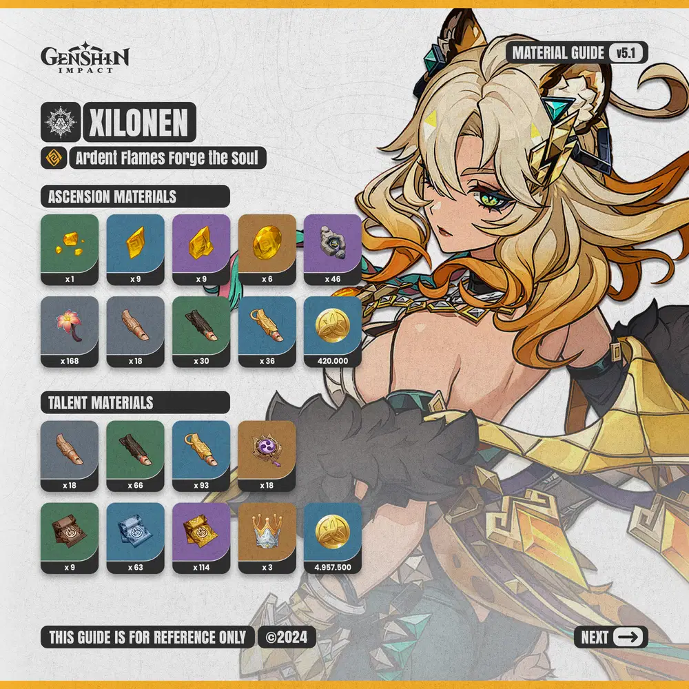 Berikut adalah bahan Material yang diperlukan untuk Meningkatkan Karakter serta Talenta dari Xilonen.