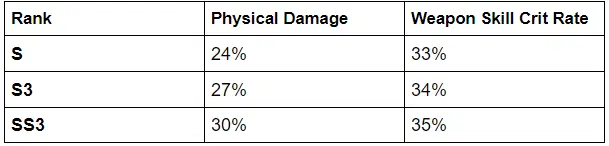 When PE leads the team, she will unconditionally boost everyone's physical damage and critical rate on weapon skills by a set amount based on her rank.