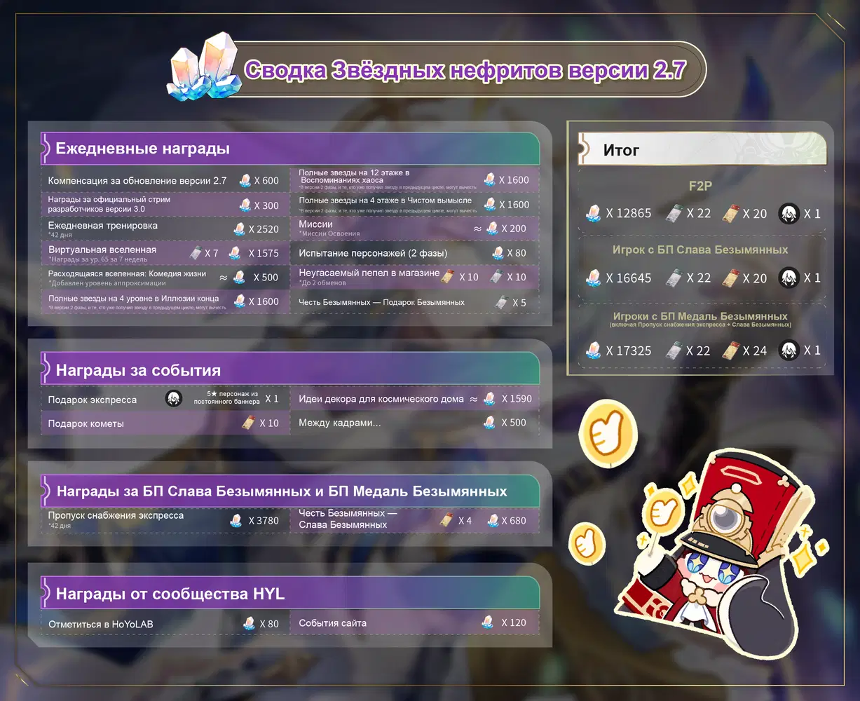 Ниже представляем сводку Звёздных нефритов в версии 2.7, основывая на текущей официальной информации. Награды за некоторые события зависят от уровня Равновесия игрока и мощности отряда, поэтому окончательное количество Звёздных нефритов будет определяться в игре~