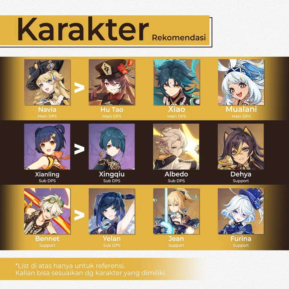 Contoh Urutan Skill: Zhongli Skill + Burst > Albedo Skill > Jean Burst > Xiao - Burst - Plunge Attack.