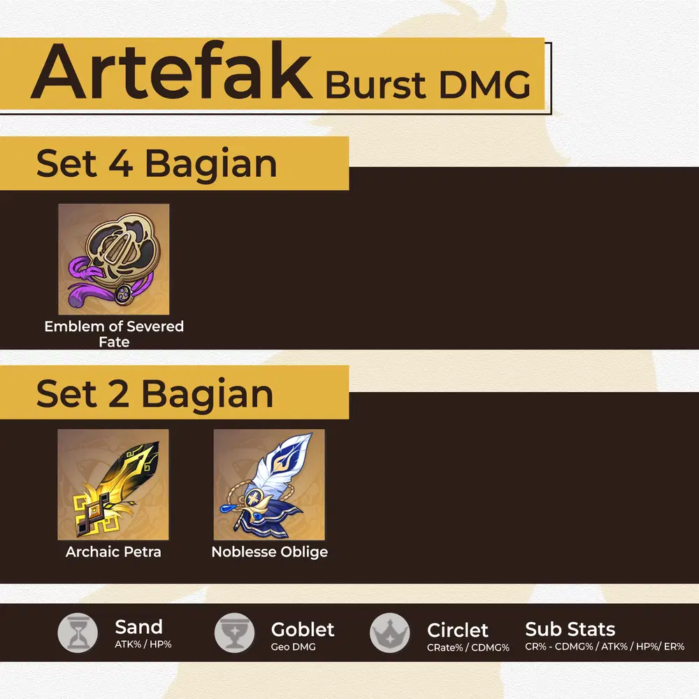Fokus kita adalah bagaimana meningkatkan DMG Burst Zhongli. Beda dengan Senjata, Artefak tidak ada yang meningkatkan Crit Rate dan Crit DMG yang cocok dengan Zhongli, jadi kita meningkatkan DMG-nya dengan Artefak yang memberikan Bonus DMG dan sejenisnya.