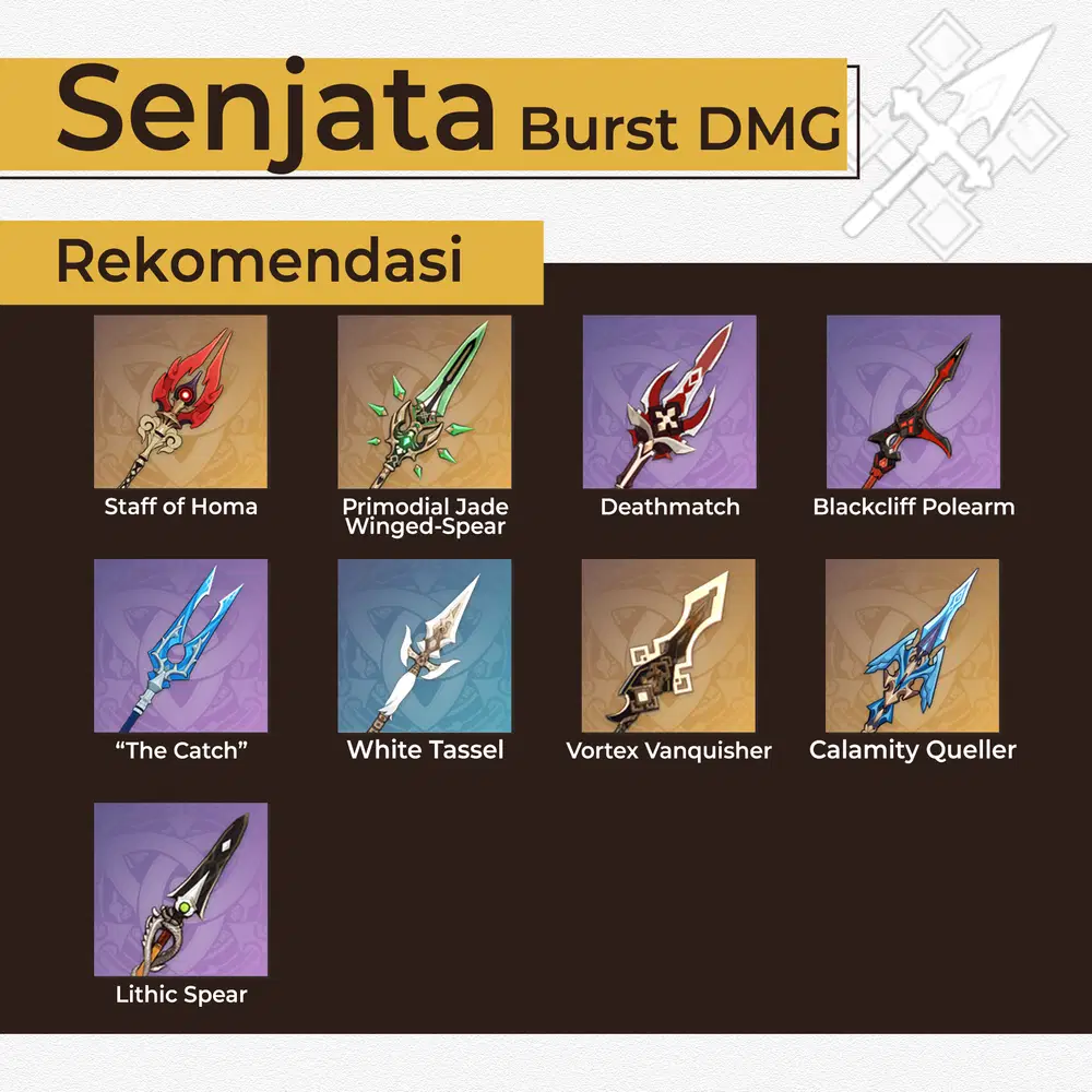 Fokus kita adalah bagaimana meningkatkan DMG Burst Zhongli, jadi Senjata dengan Stats Sekunder Crit Rate dan Crit DMG sangat menguntungkan untuk dia.