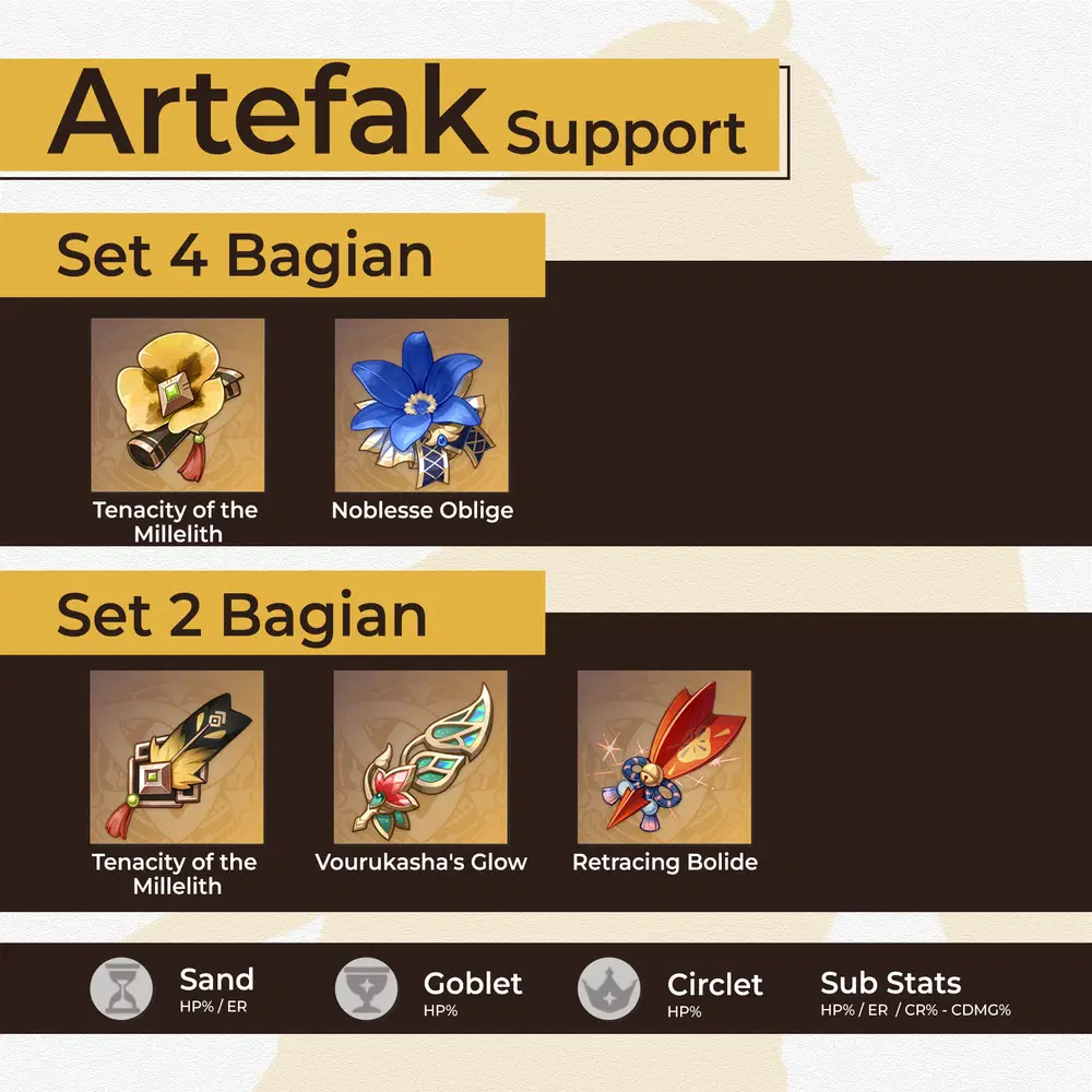 Substats: HP% / ER%, (Opsional) Crit Rate / Crit DMG