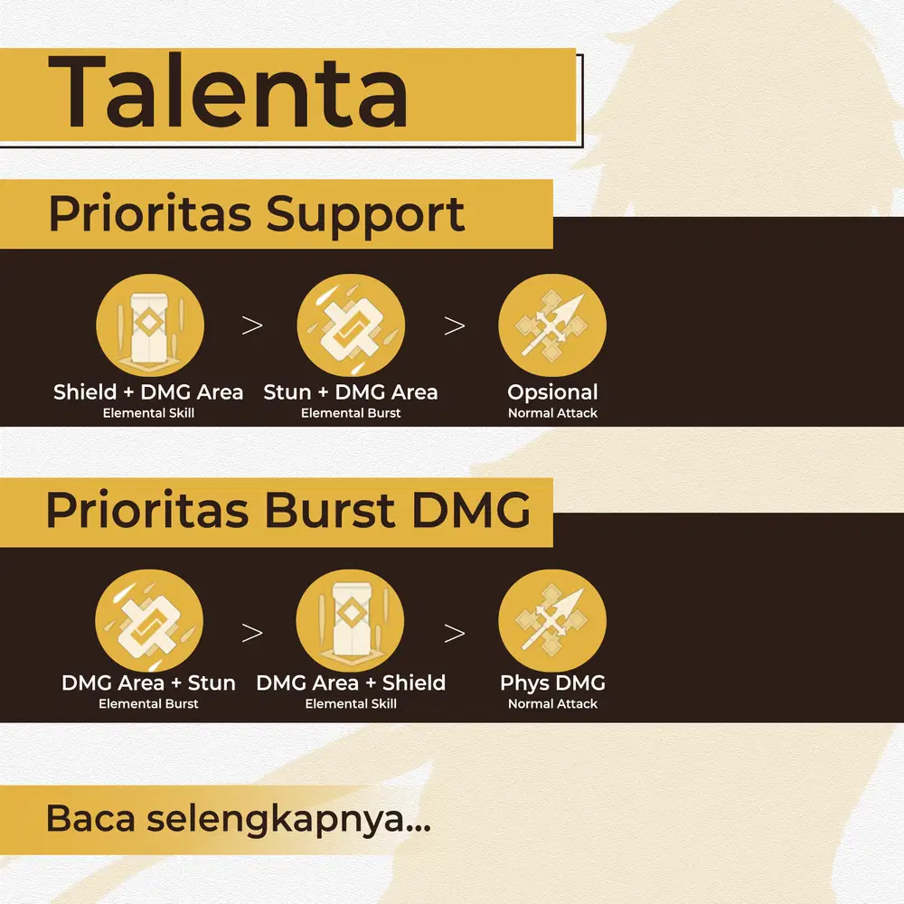 Prioritas Talent Zhongli berbeda sesuai bagaimana dia akan digunakan dalam team yaitu Support dan Burst DMG atau Sub DPS.