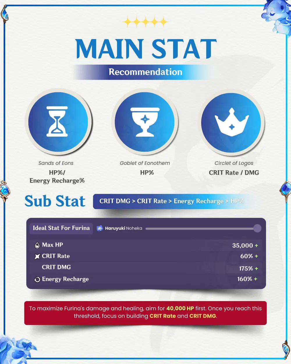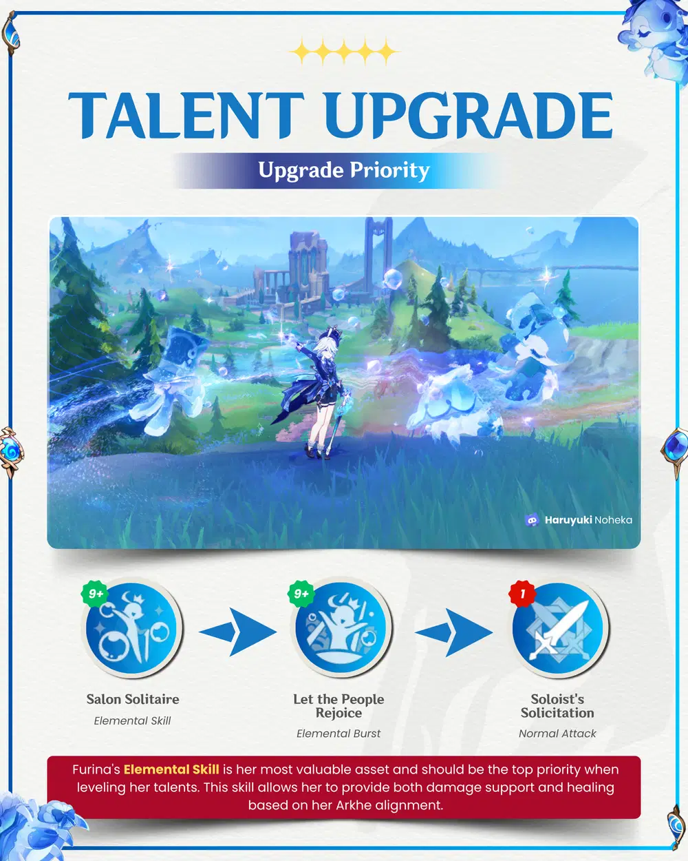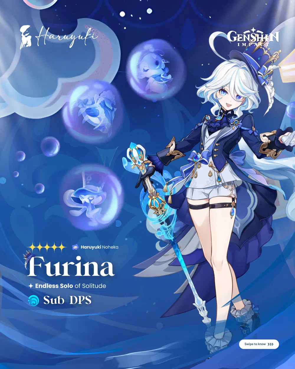 Furina is a versatile buffer who enhances all types of damage dealt by her teammates, making her highly flexible in various team compositions. Beyond her role as a support, she also excels as a Sub-DPS since both her buffs and personal damage scale with HP. The stronger her buffs, the higher her own damage output, allowing her to surpass other buffers without sacrificing her supportive capabilities.