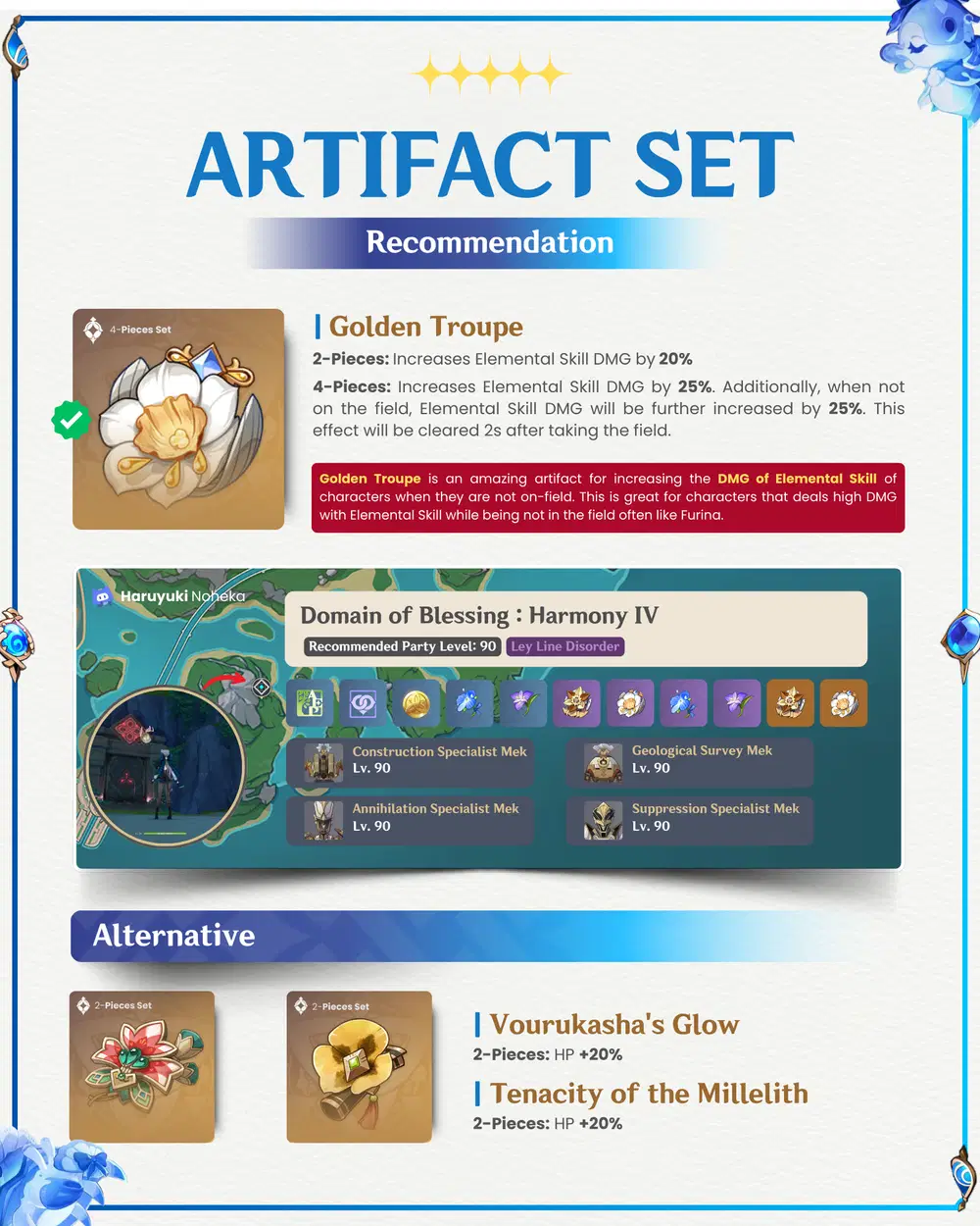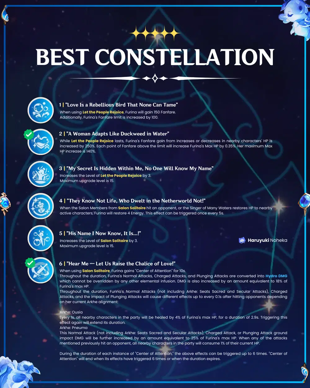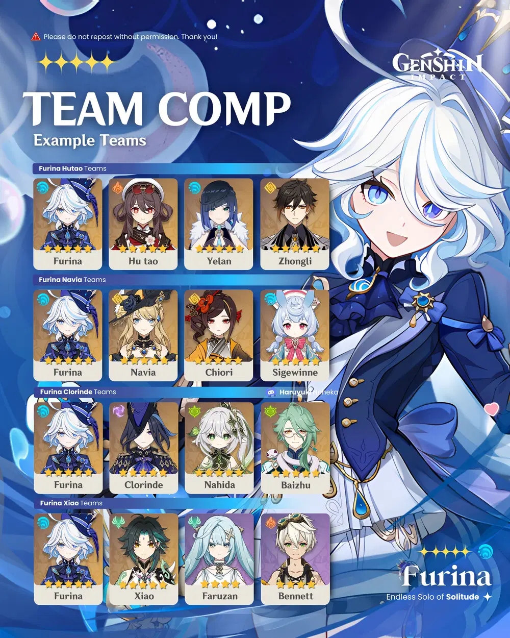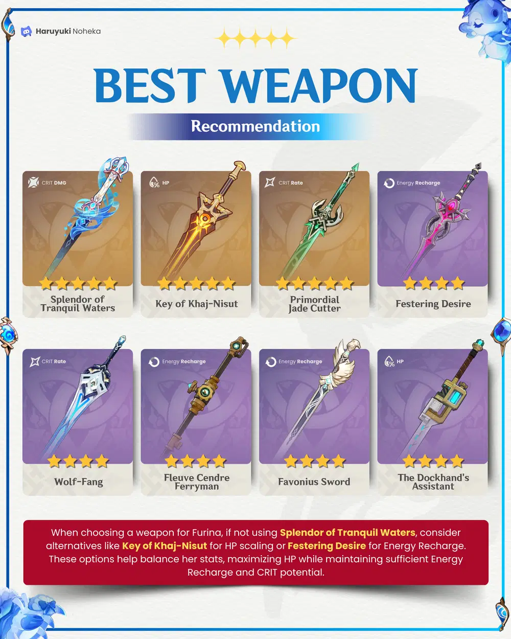Furina is a versatile buffer who enhances all types of damage dealt by her teammates, making her highly flexible in various team compositions. Beyond her role as a support, she also excels as a Sub-DPS since both her buffs and personal damage scale with HP. The stronger her buffs, the higher her own damage output, allowing her to surpass other buffers without sacrificing her supportive capabilities.