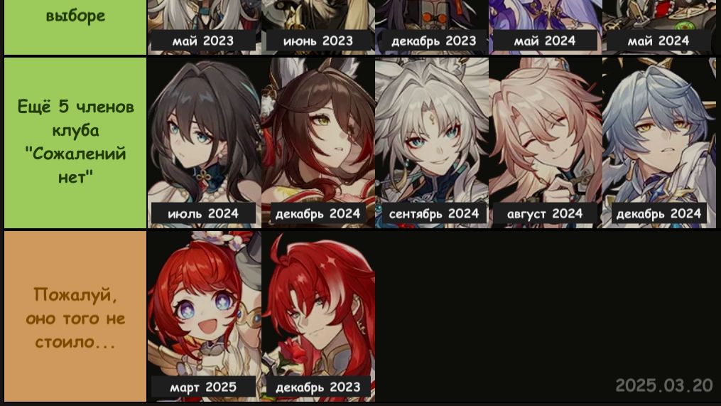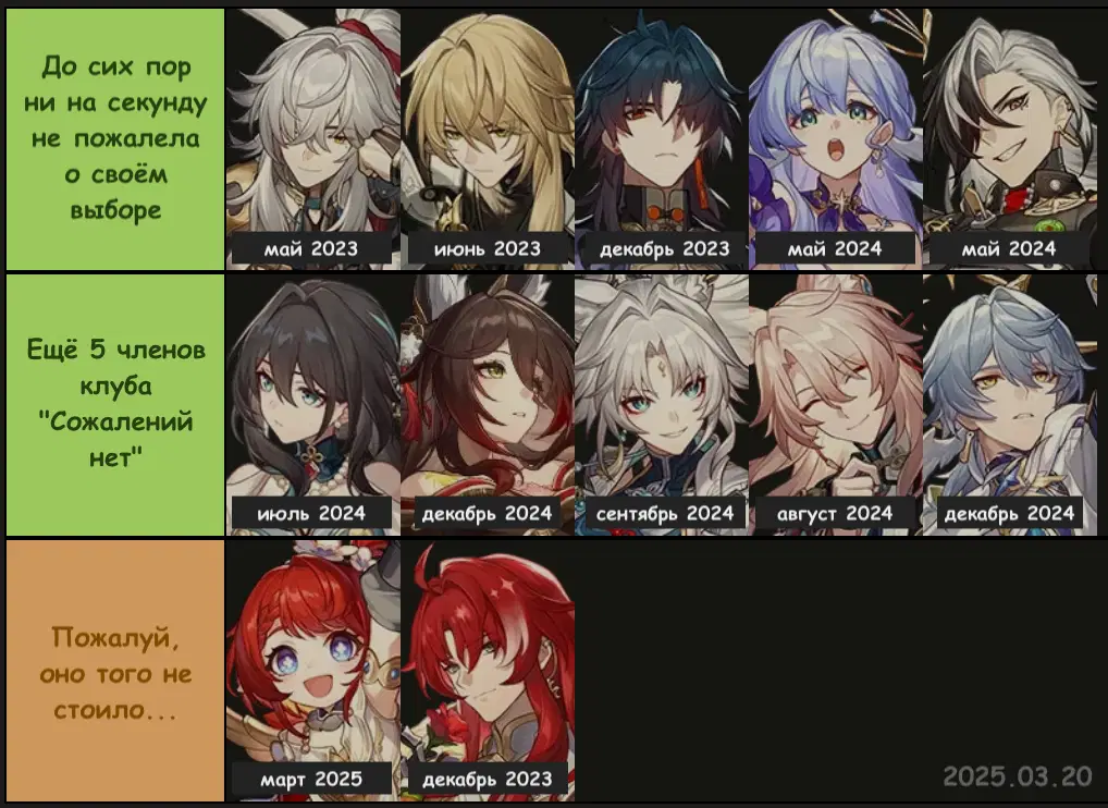 Аргенти в общем-то прикольный персонаж, и лорно, и геймлейно, но у меня все ресурсы ушли и продолжают уходить в более симпатичных мне персонажей. Возможно или даже скорее всего, если бы мне в своё время не повезло и мне не выпал Блэйд (смотрите на даты получения персонажей на картинке), то я бы, скажем так, сконцентрировала все свои силы на Аргенти, но-о... ему не повезло. Блэйд мне выпал, поэтому всё внимание досталось ему. Иногда я, конечно, беру Аргенти в какой-нибудь эндгейм чтобы развлечься или просто потестить команды, но 133 круток явно того не стоили. Блэйда, Цзин Юаня и Бутхилла хватает мне с головой ра все виды контента. Ну а конкретно для ЧВ ещё и Химеко с мини Герточкой есть.
