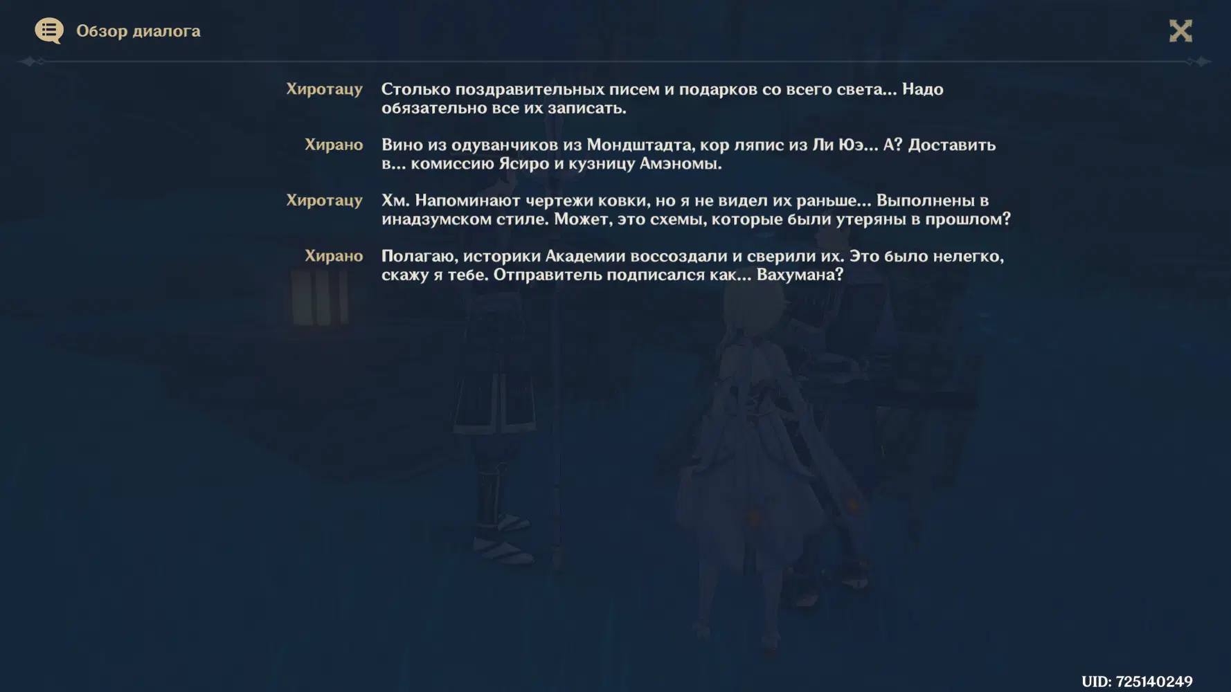 Основной ивент был посвящён Инадзуме, и данный диалог двух нпс был доступен только после полного прохождения всех квестов ивента. Чтобы понять тут написанное, для тех, кто не знает, очень кратко, - в Инадзуме некогда существовало пять великих кузнечных школ "Райдэн Гокадэн". Среди них были Амэнома (ныне существующая), Фуцу, Иссин, Хякумэ и Сэндзю. Камисато Аято и Аяка, а также Кадзуха также являются потомками этих школ. Пару столетий назад, уже после вступления в Фатуи, Сказитель подделал чертёж заказанного у кланов меча, из-за чего почти всех казнил Сёгунат, кого-то лично зарезал Скарамучча, и выжили только Амэнома, Камисато и Каэдхары в лице Кадхухи.