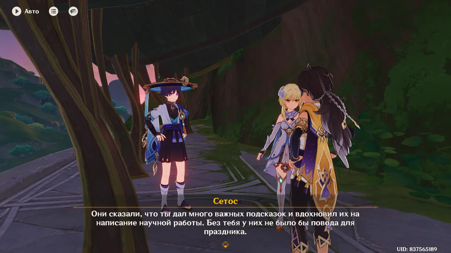 Помимо основной сюжетки с подготовкой сюрприза Нахиде, после каждой из трёх частей ивента появлялось по новому диалогу с Лайлой, которая всё ещё учится, и со Странником, который... стоит, активно избегает социум и скорее всего вспоминает прошлый Сабзеруз... Тот самый, где происходило обожествление Сказителя, да.![]()