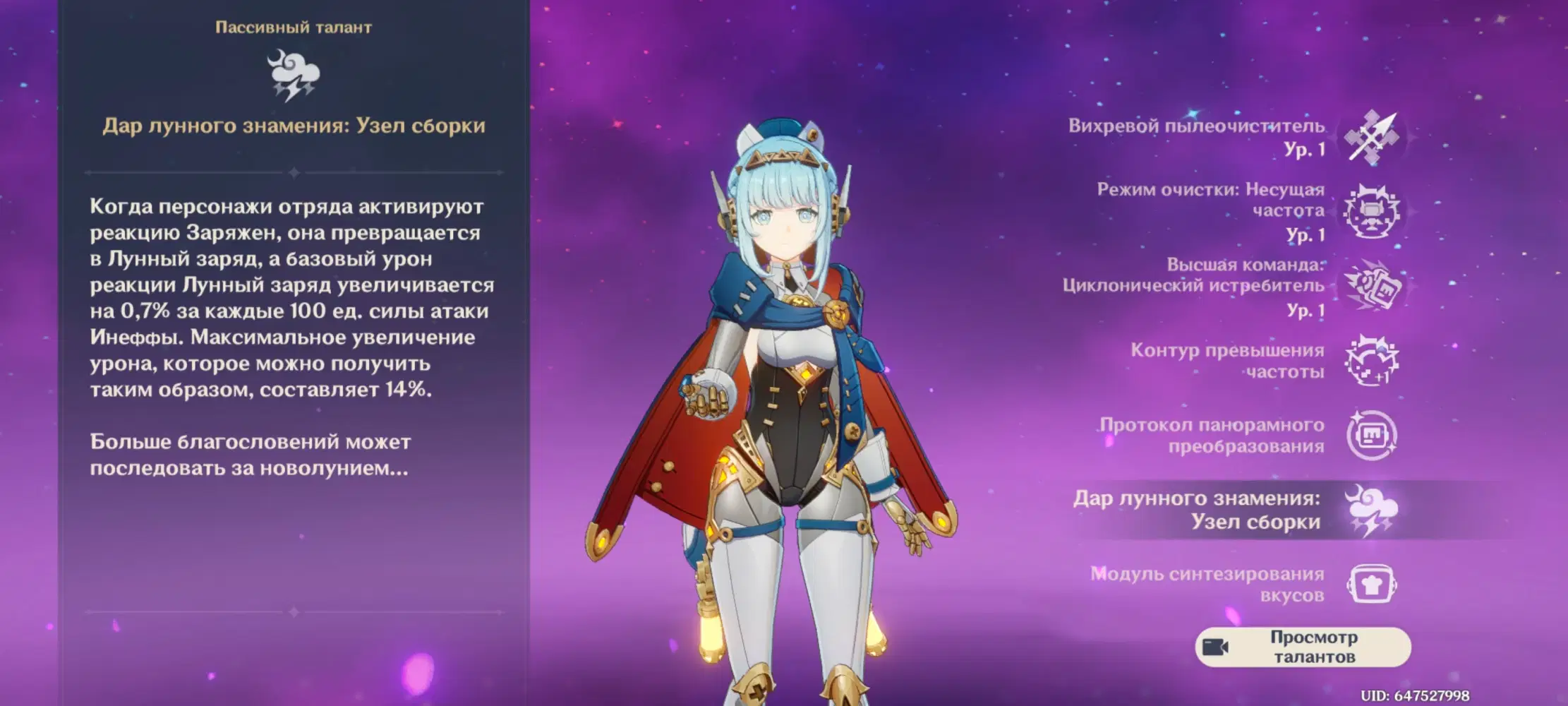 Вторая пассивка: она даёт прибавку в 14% к реакции «Лунный заряд», если у Инеффы сила атаки равна примерно 2000 ATK. Теперь вопрос: а нужен ли этот персонаж в своей базово-Ф2П форме? Ведь она не даёт практически ничего полезного, для тех, кто думает, что только она способна вызывать реакцию «Лунный заряд». Спешу вас обрадовать: реакция «Лунный заряд» доступна каждому персонажу Нод Края! То есть вы потратите 80 пулов, чтобы получить персонажа, который даст вашей команде всего лишь 120 МС и 14% к урону. Ах да, ещё щит в придачу!
