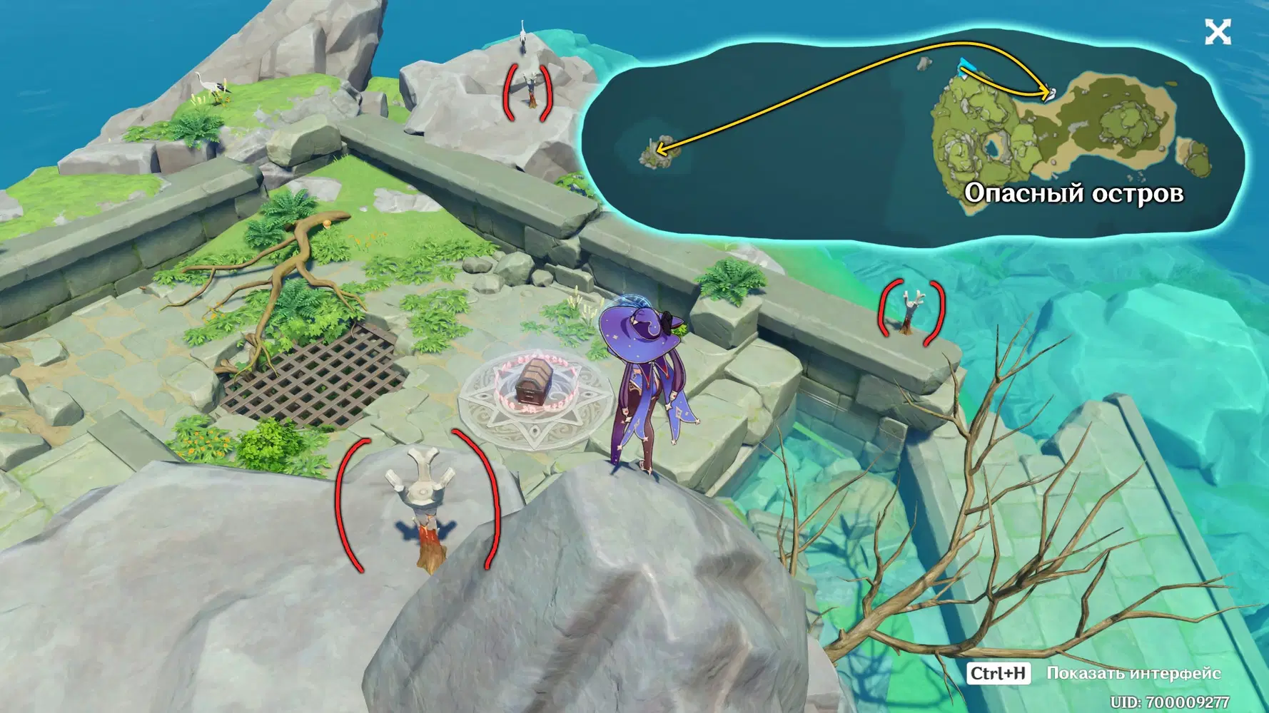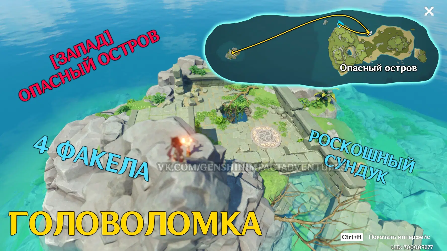 Телепортируйтесь на опасный остров, призовите Плотву и отправьтесь на запад от опасного острова на маленький островок, там вы найдете головоломку, зажгите три факела.