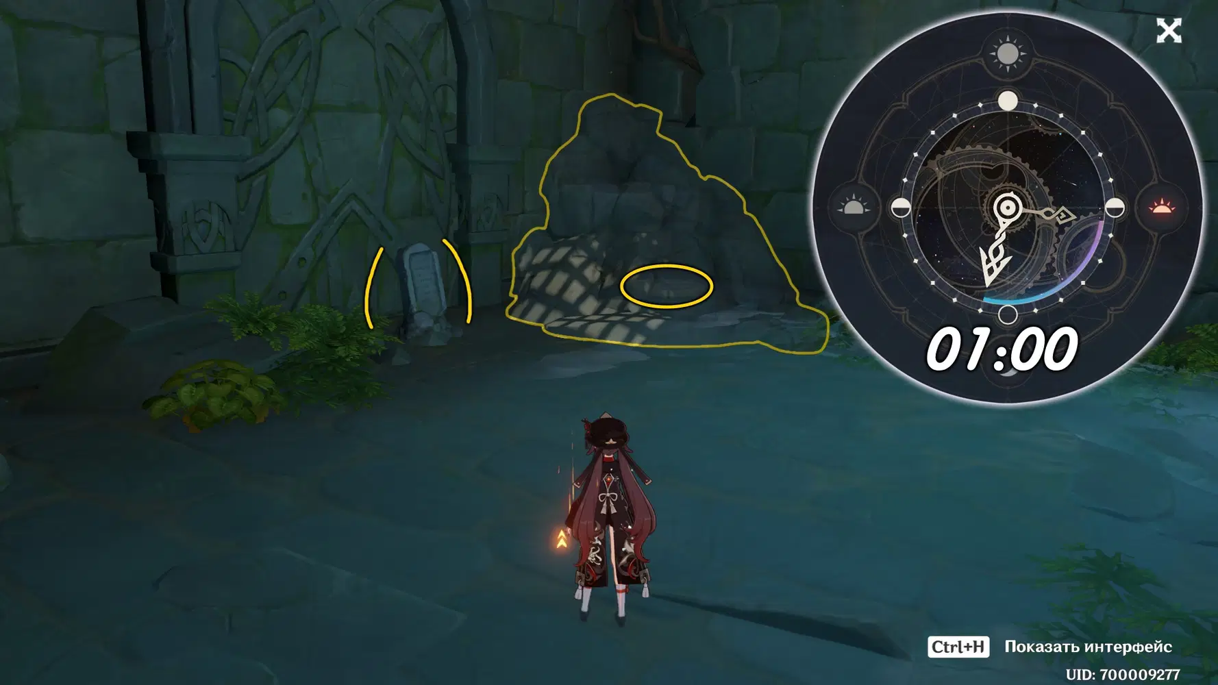 Пройдите через ворота, они захлопнутся. Осмотрите каменную табличку, в ней говорится «…около часа ночи, наверное, будет самый подходящий момент…». Отдохните до часу ночи, разломайте скальную породу, в комнате появится вода, затем встаньте на нажимную плиту. Комната начнет наполняться водой и откроется решетка сверху.