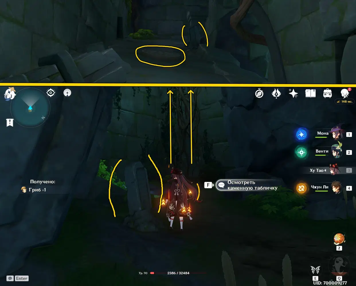 Осмотрите каменную плиту и залезайте по корням вверх. Пробегите вперед по коридору, осмотрите каменную плиту и встаньте на нажимную плиту, откроются ворота.