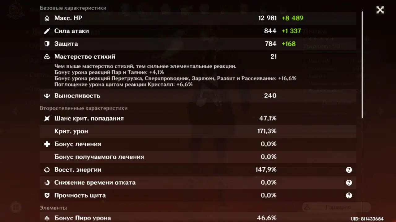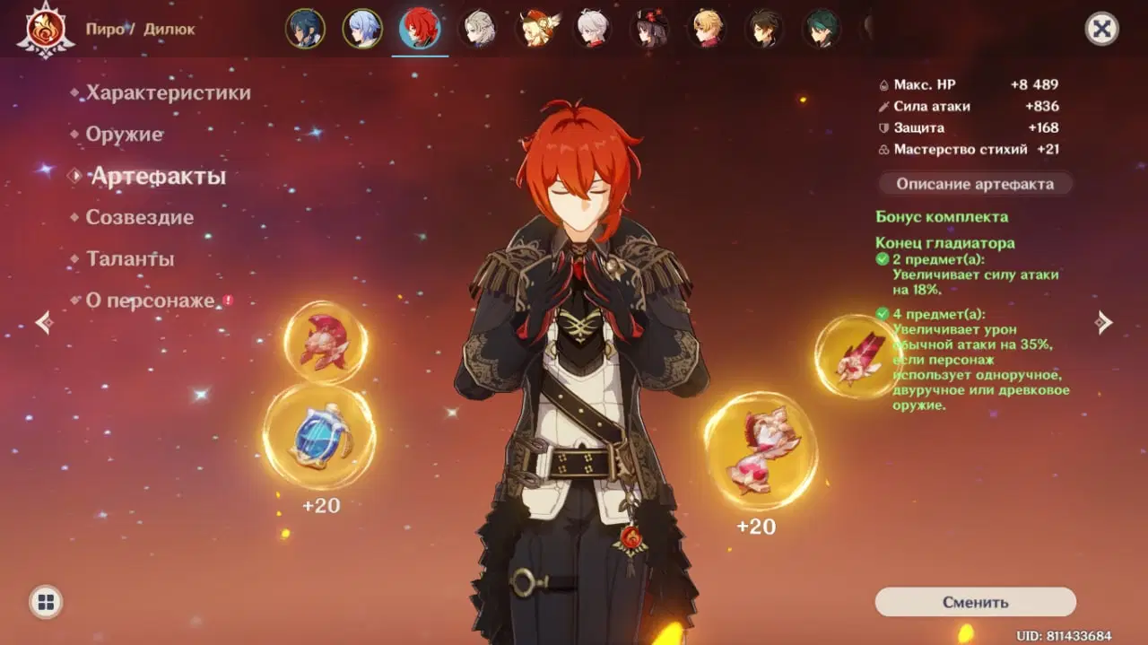 Рекомендовані головні стати: Кубок - піро урон, Шапка - шанс критичного влучання/ критичний урон, годинник - сила атаки
