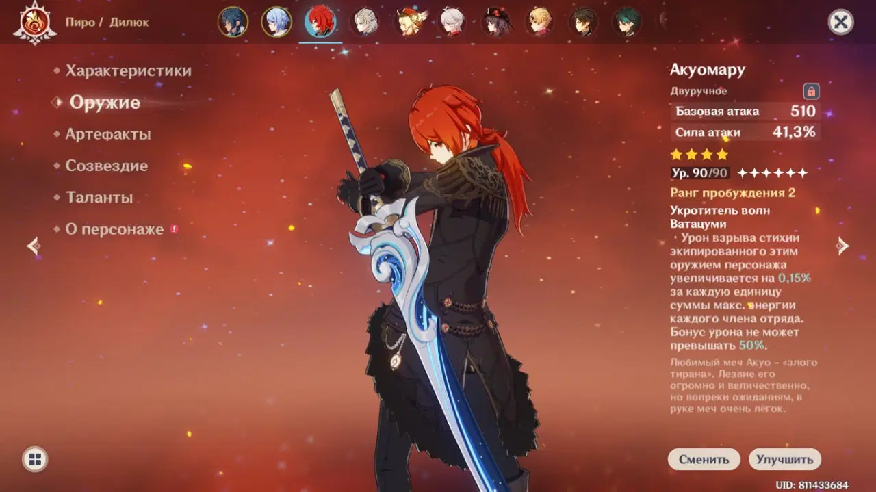 Дістати його можна виключно із банеру зброї і виключно він представлений у банері, тому що ця серія є чимось типу лімітки, яку не додали до списку стандартів. Дуже гарний варіант під револьверні команди, тобто ті, де персонажі по черзі виходять та протискають свої елементальні навички. Стаки збираються швидко, бонус смачненький, а база і відсоток сили атаки також радують. Чим більше пробуджень, тим краще